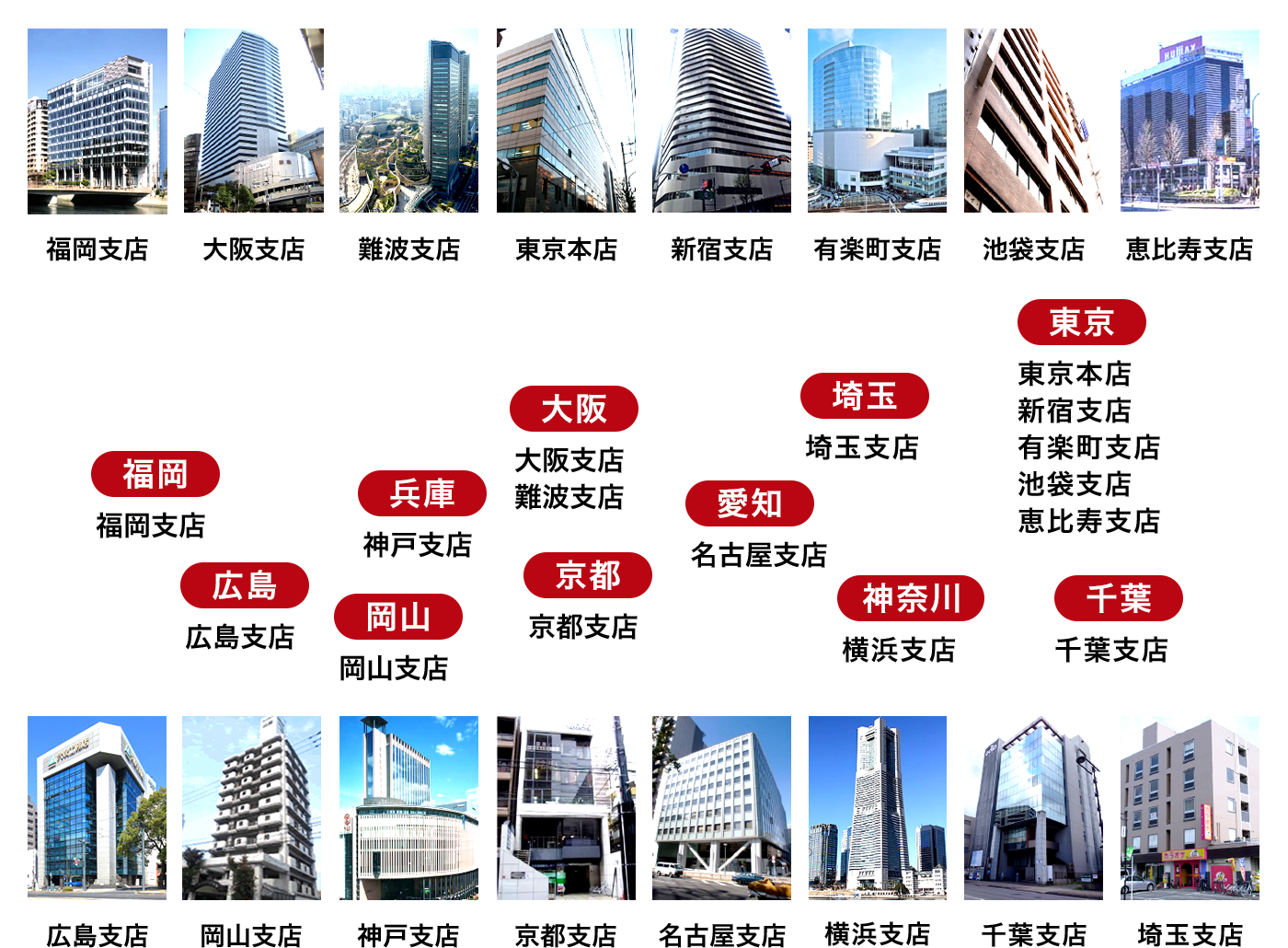 【東京本店】 【新宿支店】 【有楽町支店】 【池袋支店】 【恵比寿支店】 【八王子支店】 【横浜支店】 【厚木支店】 【大宮支店】 【越谷支店】 【千葉支店】 【名古屋支店】 【梅田支店】 【難波支店】 【神戸支店】 【京都支店】 【岡山支店】 【広島支店】 【福岡支店】 |