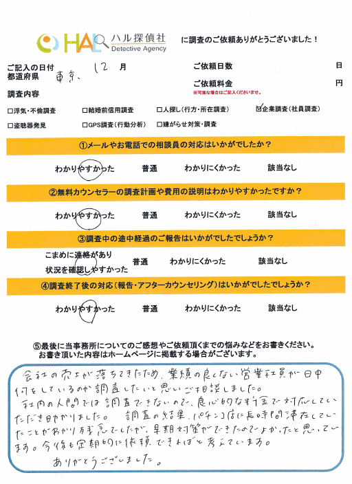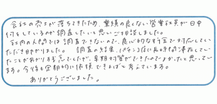 最近会社の売り上げが落ちてきた。素行の悪い社員が数名いるが日中何をしているのか?しっかり取引先をまわっているのか?調べて欲しい。