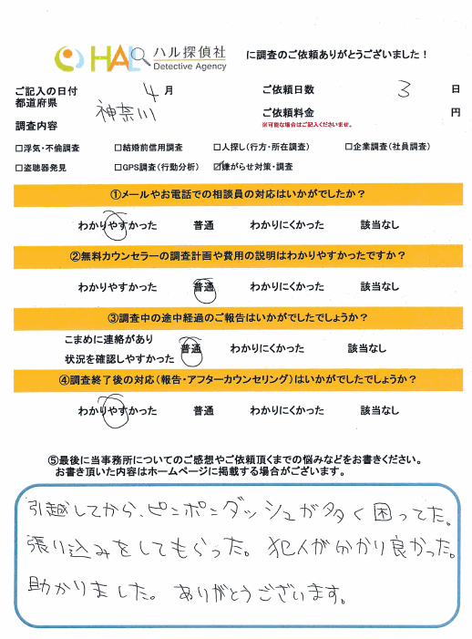 HAL探偵社にご相談いただく前に警察にご相談したようですが、事件性が無く証拠が無いとのことで何も状況が変わらなかったとのことでした。