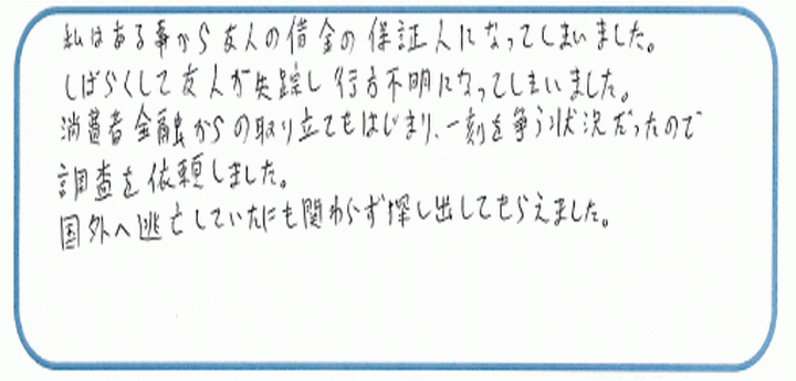 友人の父親が入院してしまいお金が必要とのことで借金の連帯保証人になったが、友人が失踪してしまい私の方に取り立ての催促が来て困っており早急に探して欲しい。