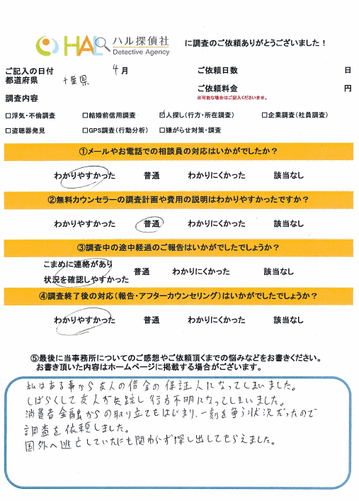 学生時代の友人を手掛かりに調査を開始。聞込みした結果、韓国にいることが判明し居場所を特定することに成功した。また実家の住所も割り出しご両親も交えて話し合いをし全額返済をしていただくことになった。