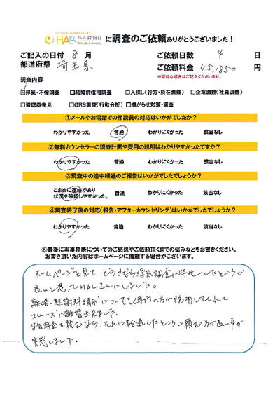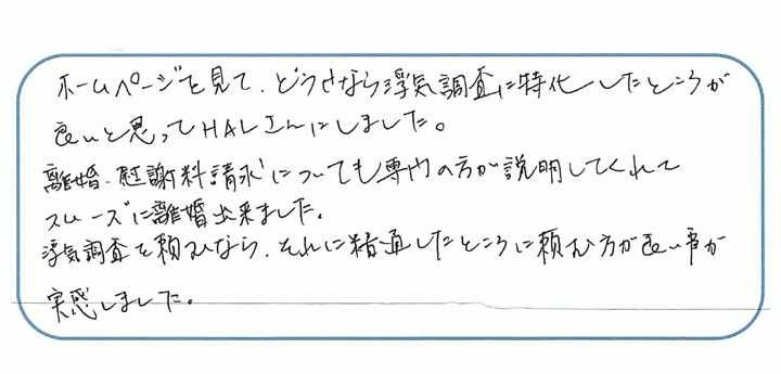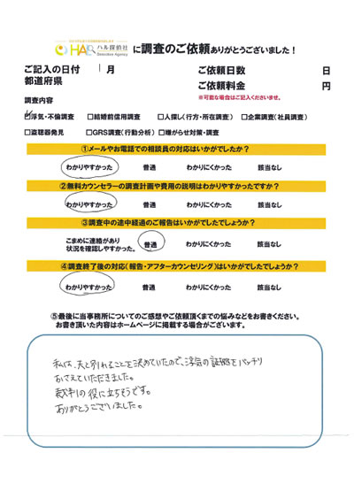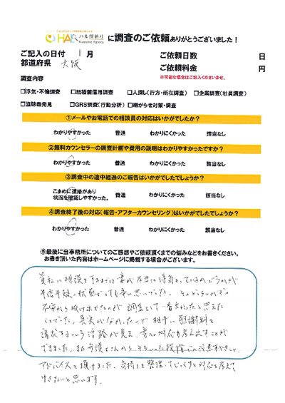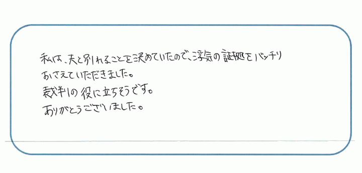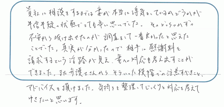早い段階でご相談いただいたので調査を成功することが出来たと思います。タイミングを外すと対象が警戒し調査が失敗することもありますので良かったです。