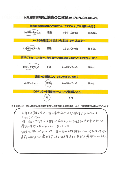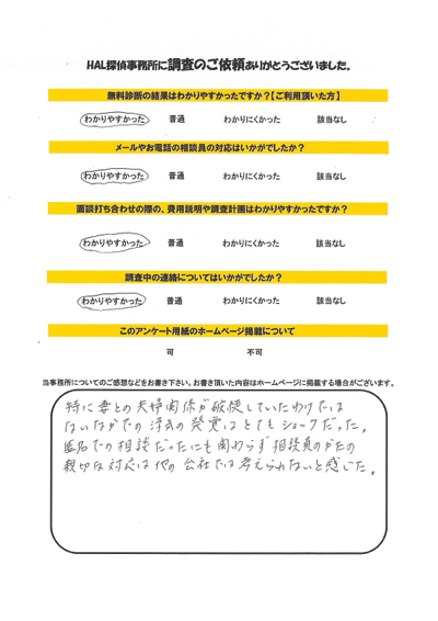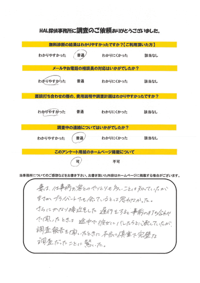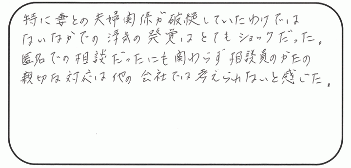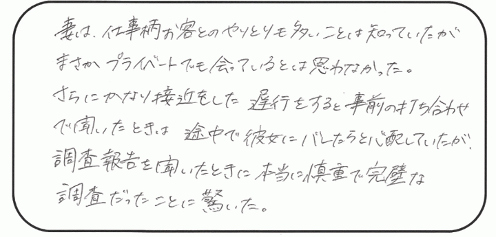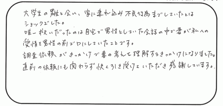 途中スーパーで買い物をし、自宅に一緒に入ったところを確認。その後、妻とその男性は自宅で3時間程過ごした。妻は男性を最寄りの駅まで送ると、その後預けていた児童施設に娘を引き取りに行った。後日、会った男性はまだ大学生で出会い系サイトで知り合い新幹線に乗り日帰りで妻に会いにきていたことがわかった。