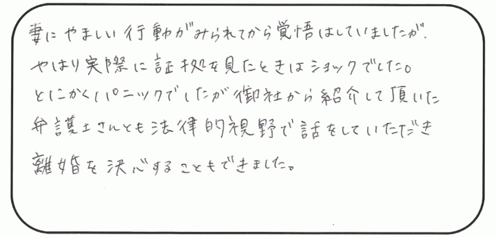 2カ月後不審な行動があったので、夫の外出の後を着けたところその時の女性と会っているところを見てしまった。本気で離婚を考えており子供もいることから裁判のことも考えて浮気の証拠をつかんでほしい。