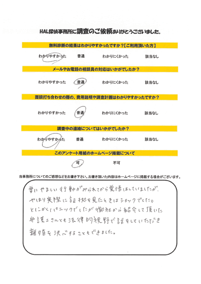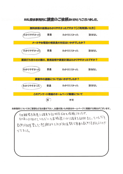 HAL探偵事務所では協力弁護士と共に、仮に依頼主様が離婚を決意された場合には慰謝料請求等の法的手続きを完全サポートいたします。お仕事をされている男性には大変体力のいる作業になります。是非私どもにお手伝いさせてください。