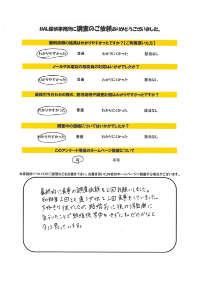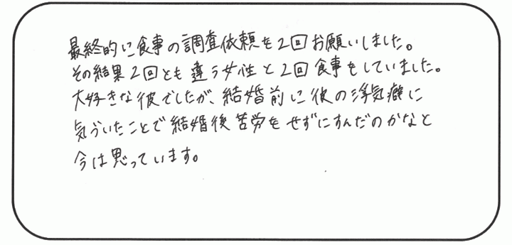 最近若い夫婦で妻のほうが夫の浮気に悩まされており、こんな人だと知っていたら結婚しなかったというケースがあります。また、お付き合いをされているときに本当は浮気調査をしたかったのだけど高額なためその時は踏み止まったという方もいらっしゃいました。