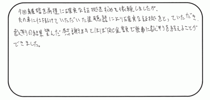 最近離婚を決意されてからの依頼が多くなっております。ご自身で浮気を知ってしまい、一度は離婚を思いとどまったものの相手が実は浮気相手と切れていなかったというケースです。この場合依頼主様は裁判を見越しての決定的な証拠を求めての依頼になりますので私どもといたしましても緻密な調査計画を練るために事前に依頼主様にご協力いただき配偶者並びに浮気相手の情報をできるだけ集めます。今回のケースでは浮気相手の住まいに関する情報や過去に浮気が発覚した時の細かい経緯等です。また、自家用車に浮気相手が乗車する可能性があったため事前に車内に盗聴器を仕掛けました。その結果写真だけでなく二人の不貞行為を決定づける会話の証拠を掴むことができました。