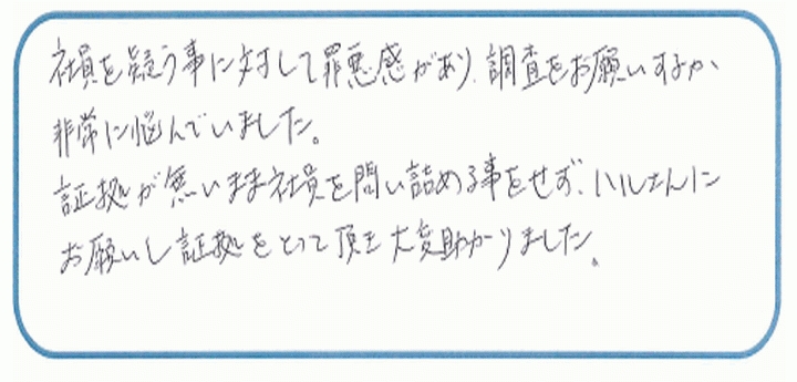 ご相談に来られるほとんどの方は不安を抱えていらっしゃいます。また不貞の証拠をとった後どのようにすれば良いのか悩まれている方が多いようです。そのような場合は弁護士をご紹介させていただくことも可能です。