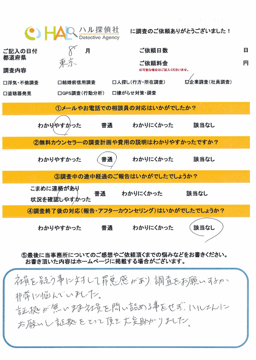スーパーを経営している社長様からのご依頼。商品の横流しをしている様子の社員がいるので事実かどうか調べて欲しい。