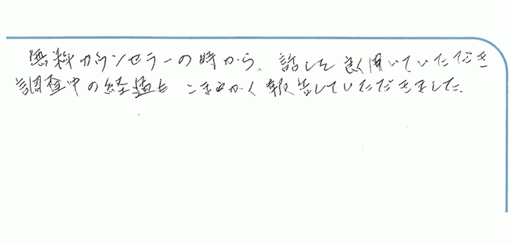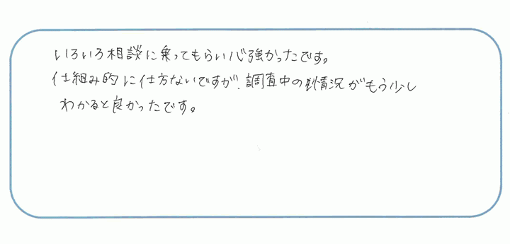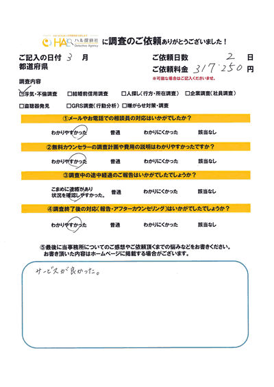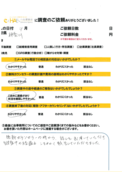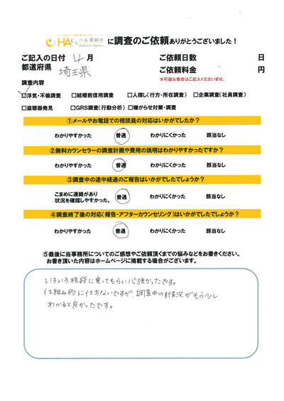 今回は浮気相手の自宅は判明しましたが不貞の証拠は取れず終了してしまいました。対象が非常に警戒行動をとっていた様子だった為、調査員から細めな連絡が入りませんでした。お客様のご意見を反映するため当社で改善出来る内容が無いか検討します。