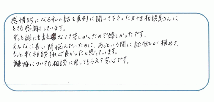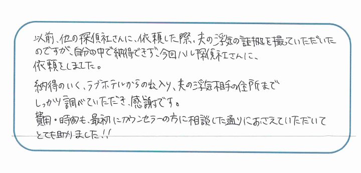 以前他の探偵会社で不貞の証拠を取ったにも関わらずHAL探偵社をご利用いただきありがとうございました。2度と浮気をさせないように浮気相手に対して慰謝料請求するのもご検討ください。