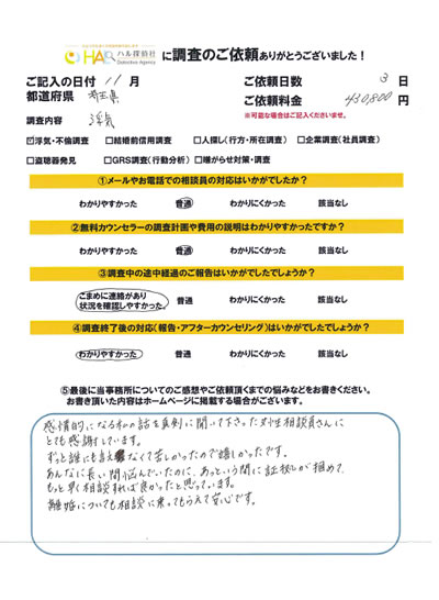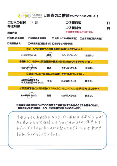 お客様のように離婚しないで慰謝料請求もしない方も多くいらっしゃいます。HAL探偵社ではこのように1日だけの調査もお受けしています。
